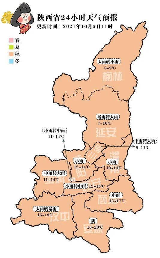 据陕西气象台最新预报:今天下午,全省阴天,陕北有中到大雨,中南部部分地方有暴雨,关中有小到中雨,西部局地、北部局地有大到暴雨,汉中有中到大雨,中北部局地有暴雨,安康中北部、商洛大部分地方有小雨,安康北部局地有大雨。