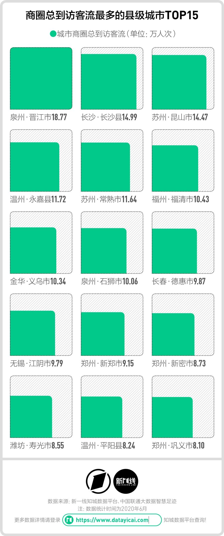 不过商业实力的强弱并不完全决定商圈的人气。结合知城数据平台上的到访客流数据,我们能够看到一份截然不同的县级城市排名。