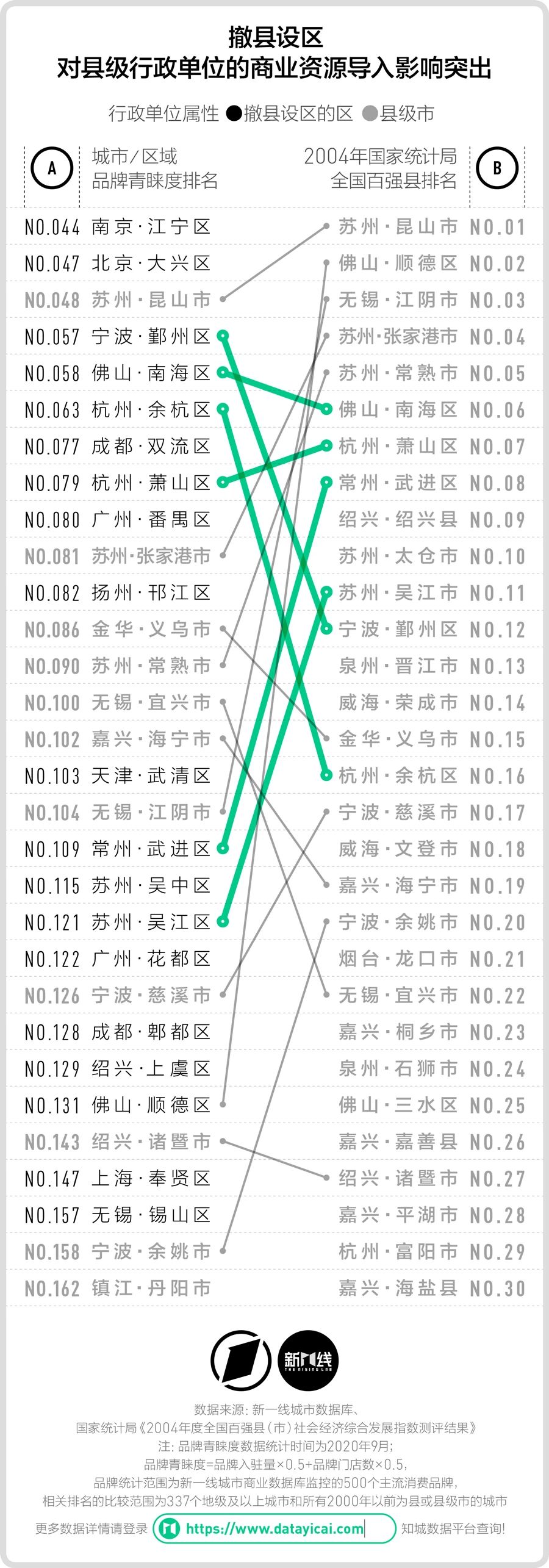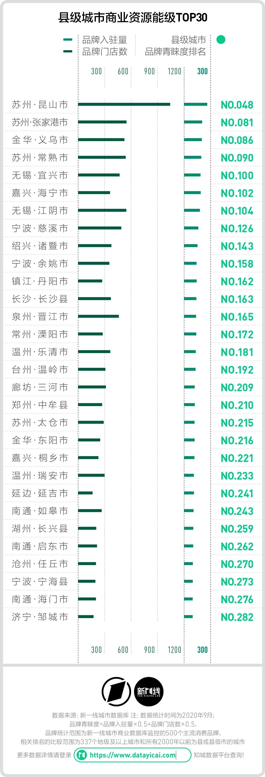 结合《城市商业魅力排行榜》中对商业资源集聚度的研究方法,新一酱这里将知城数据平台收录的500个重点消费品牌在县域地区的品牌门店数和品牌入驻量作为关键指标,计算出了各城市的品牌青睐度排名,并在相同数据源和算法框架内与地级城市比较。
