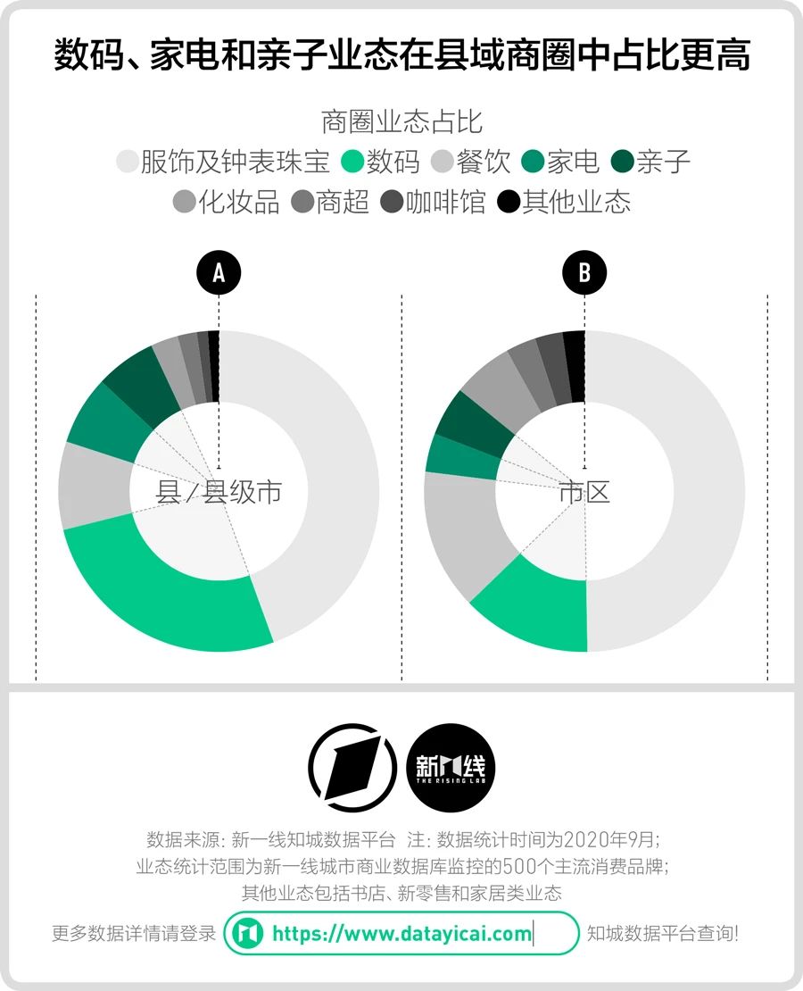 新一酱顺手将县级城市里商圈的业态结构与地级市市区做了对比,数码、家电和亲子业态在县级城市商圈中普遍占比更低。