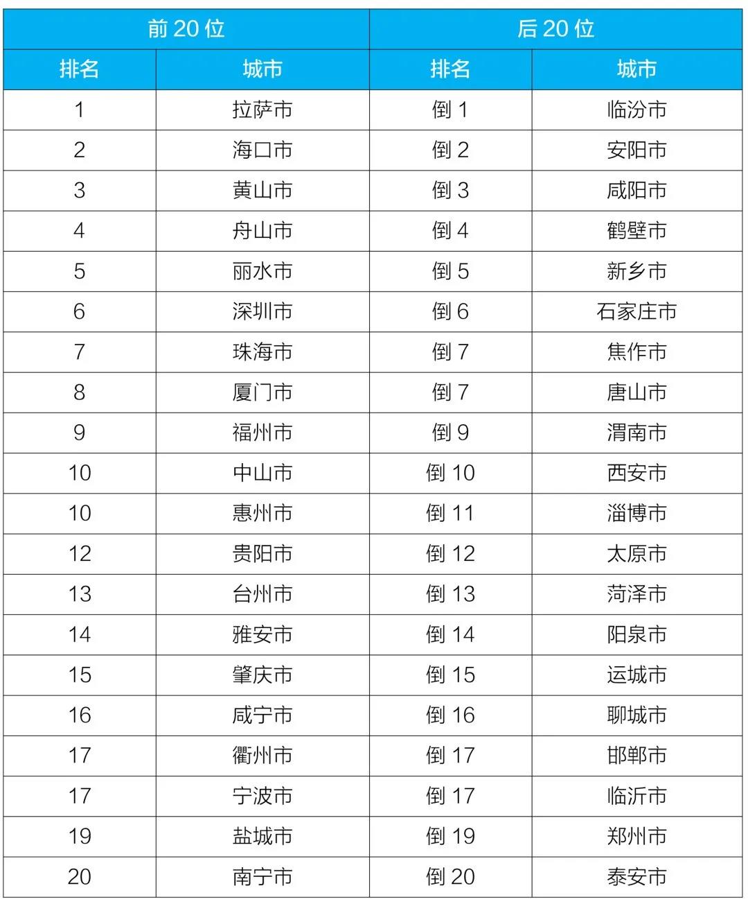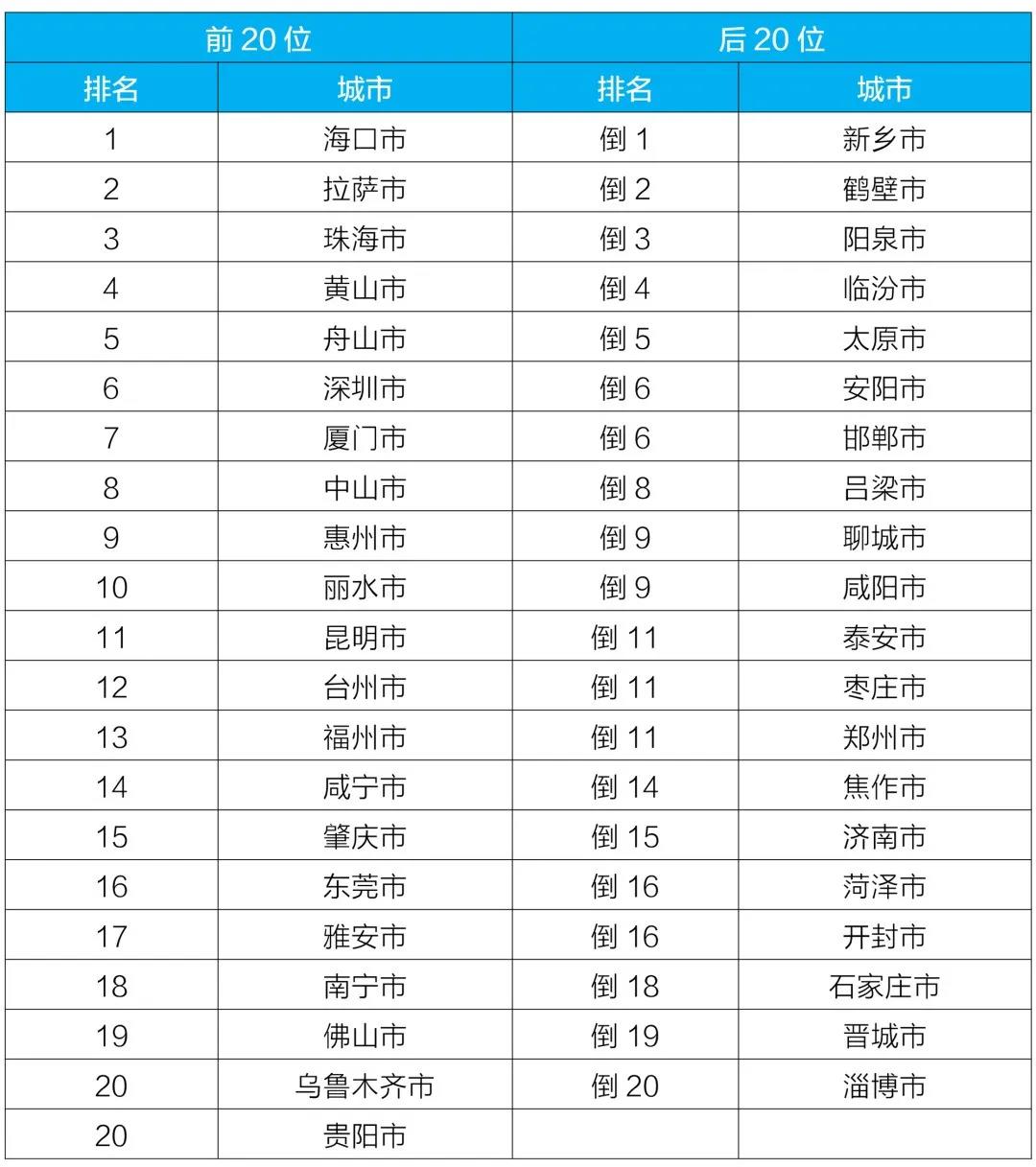 2021年1-6月168个重点城市空气质量排名前20位和后20位城市名单。来源:生态环境部微信公众号