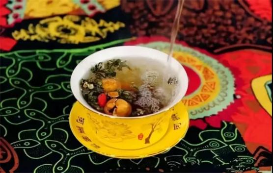 八宝盖碗茶是临夏各族群众普遍饮用的一种茶。由盖子、茶盅、掌盘三层组成。用上等的茶叶,桂圆、葡萄干、枸杞、大枣、优质冰糖为佐料配制而成,用煮沸的“牡丹花”开水冲泡,是馈赠亲友的首选。