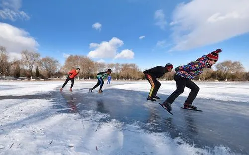 ↑ 爱好冬季运动的市民在植物园东园滑冰,快乐的心情如同好天气一样。