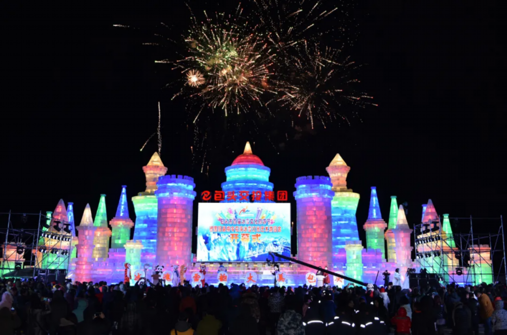 ↑包头市首届冰雪文化旅游节暨固阳县梅令花海冰雪灯光艺术游园会开幕式。