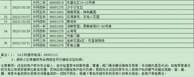 为确保今冬供热安全正常运行,青岛能源集团所属供热单位部分区域近日将对供热设施进行充水试压,为了您的财产和人身安全,请留意单元门前的《供热充水试压通知》,充水试压期间请务必家中留人,检查供热设施有无异常,避免因漏水给您及他人造成经济损失。