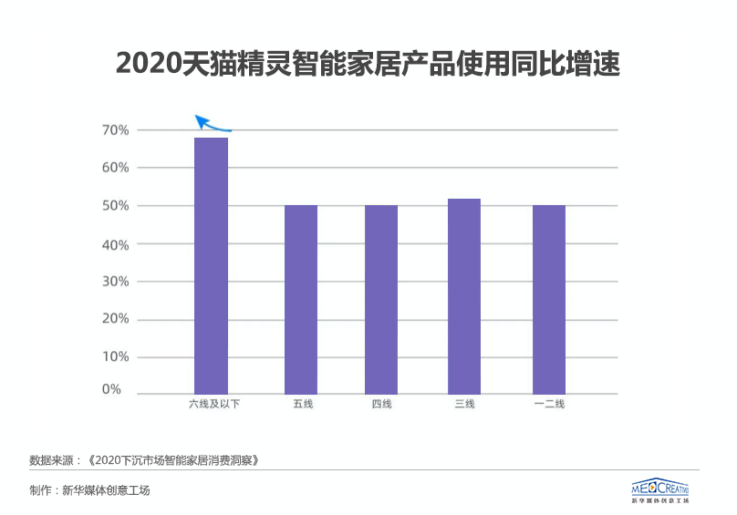 根据《2020下沉市场智能家居消费洞察》显示,50%以上的天猫精灵智能家居使用者在三到六线城市,其中六线城市用户增速最快,四线城市销量、销售额增长最快,下沉市场正在成为智能家居行业的新蓝海。同时,根据天猫平台数据显示,智能开关、智能落地灯、智能电蒸箱等价格在50元到300元之间的小家电,在下沉市场年销量同比增速均超过300%,也侧面佐证着这一现象。