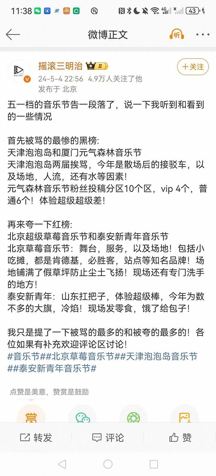 体验和吐槽:谁卷出了体验新高度?5月4日,知名自媒体“摇滚三明治”在微博发布了五一档期音乐节的黑红榜,在社交媒体上被骂得最惨的音乐节是天津泡泡岛音乐节和厦门元气森林音乐节,夸得最多的音乐节是北京超级草莓音乐节和泰安新青年音乐节。