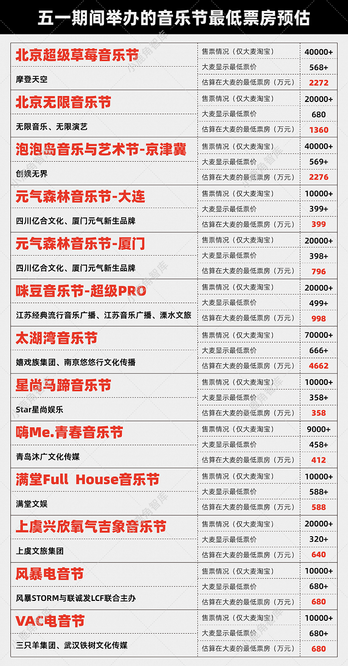 5月1日,淘宝大麦官方旗舰店显示,北京超级草莓音乐节和泡泡岛音乐与艺术节-京津冀均售出了超4万张门票,摩登天空有正在现场APP自己售票,各大音乐节大都也在抖音、秀动、猫眼、票星球等多平台售票。今年北京草莓也是五一期间唯一宣布售罄的音乐节,业内预估票房在4000万元左右,如果加上赞助商收入,音乐节整体收入估计不会少于5000万元。