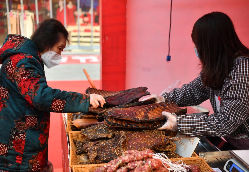 距离田凤村200余公里外的陕西省西安市新城区西北小商品交易中心年货节上,来自安康的摊主张欢也像熊哲贵一样,向往来不绝的消费者热情推介家乡的腊肉、肉干等特产,这些来自秦岭深处的土特产受到顾客的青睐,不时有人扫码购买。