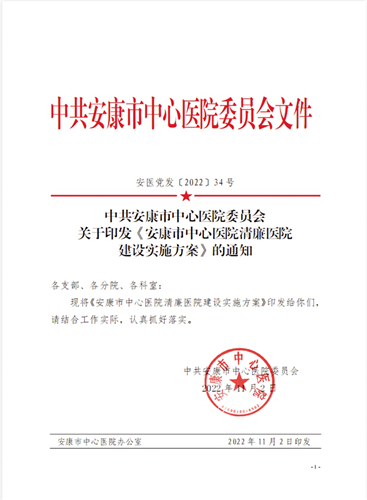 记者:2022年11月2日,安康市中心医院党委印发了《安康市中心医院清廉医院建设实施方案》。今后一个时期,医院如何围绕方案,全面推进清廉医院建设,切实把清廉要素融入全方位推动医院高质量发展全过程各方面,营造风清气正的政治生态和良好发展环境?