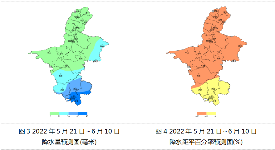 预计2022年5月下旬至6月上旬(5月21日~6月10日),石嘴山市、银川市、吴忠市利通区、青铜峡市、同心县、中卫市沙坡头区、中宁县降水量在10~20毫米之间,吴忠市盐池县、中卫市海原县、固原市西吉县在20~30毫米之间,固原市原州区、隆德县、泾源县在30~45毫米之间(图3);与常年同期相比,石嘴山市、银川市、吴忠市、中卫市偏少10%~20%,固原市偏少10%以内(图4)。