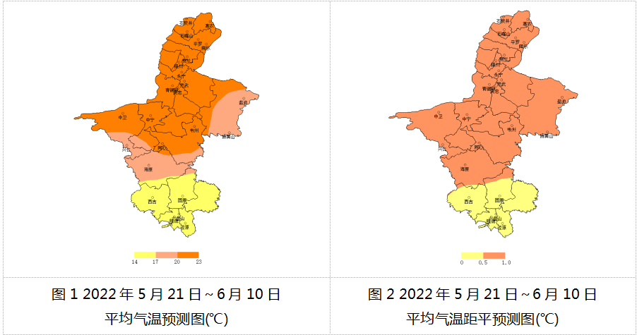 预计2022年5月下旬至6月上旬(5月21日~6月10日),石嘴山市、银川市、吴忠市利通区、青铜峡市、同心县、中卫市沙坡头区、中宁县平均气温在20~23℃之间,吴忠市盐池县、中卫市海原县在17~20℃之间,固原市在14~17℃之间(图1);与常年同期相比,石嘴山市、银川市、吴忠市、中卫市平均气温偏高0.5~1.0℃,固原市偏高0.5℃以内(图2)。