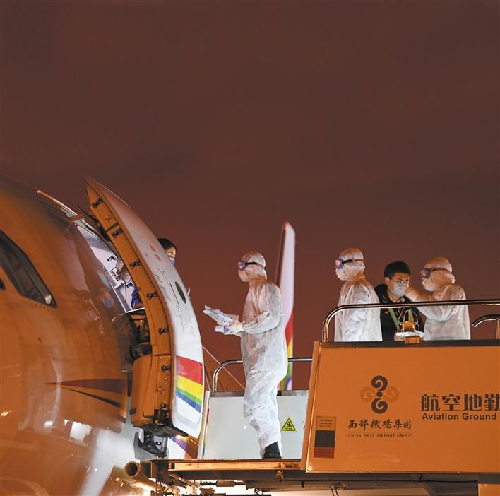 飞机一停稳,机场穿防护服的测温人员就登上飞机,对所有人员进行体温测量。“所有人都非常配合。他们知道守着这里,就是守着平安。”机坪监管呼延杨帆说。