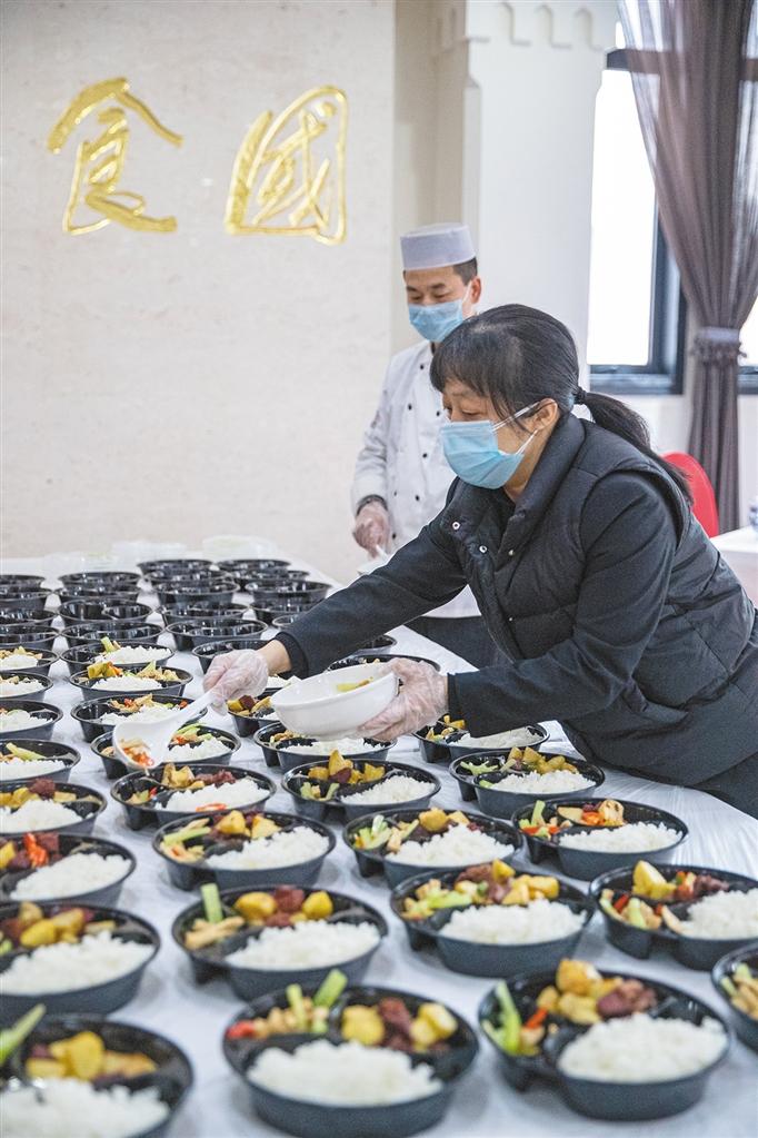 饭馆内,值班经理盛中华正忙着给盒饭装菜。清真饭菜特有的大块牛肉拌着土豆胡萝卜把饭盒塞得满满当当。“刚刚给值班警察送了一次,这是给小区里需要的人的,都免费。”盛中华说着话,手并没有停。