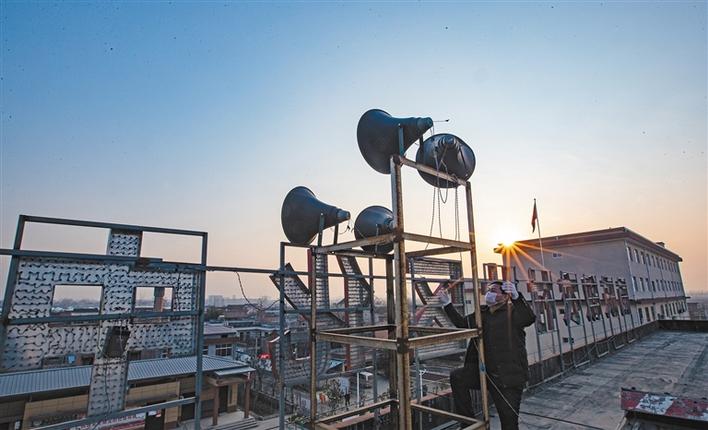 17∶05 ,村上的大喇叭声在村外就能听见。麦地已经绿油油的充满生机。村口的警戒线内,一个穿着夹克戴着口罩的男子远远就向我们摆手。说明来意后,他们给我们认真测量体温,又上下洒了一通酒精才肯放我们进村。村上党支部门口的通告很长,要求很细,时间落款是1月23日。