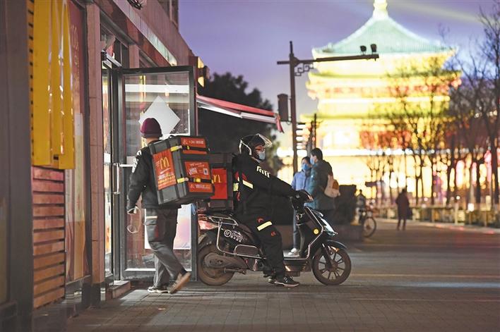 19∶05 ,钟鼓楼广场上的麦当劳店只有外卖窗口开着。这里是西安的中心,曾经繁华的街道上,此时一眼望去只有四五个匆匆行走的人。一辆205路汽车停站后,上去1个人,此后再没有任何公交车停站。