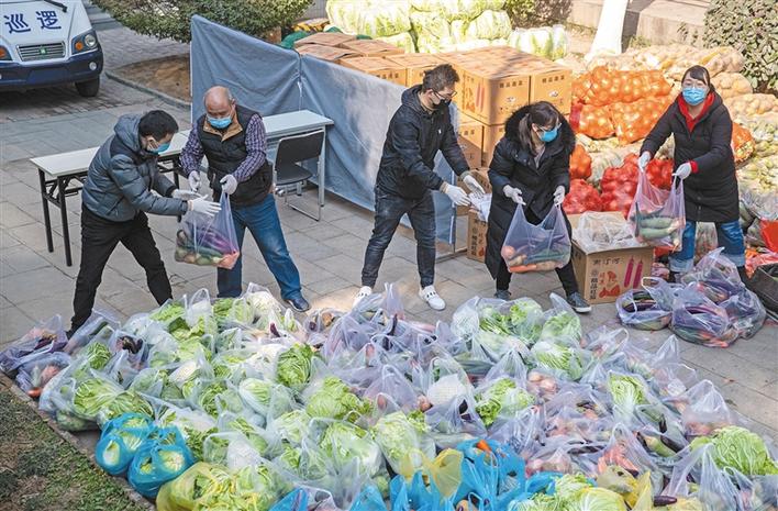 小区的一个小广场上,堆满了各种蔬菜,物业人员正拿着塑料袋一包包分装。花白2个、白菜1个、菜花1个、黄瓜3-4个、白萝卜3个、土豆3个、葱头3-4个、茄子3-4个、西葫芦2-3个、红萝卜5-6根,物业分发蔬菜的单子很清晰。小区物业主管凡兵说:“这是欣桥农产品物流中心早上免费送来的菜。”