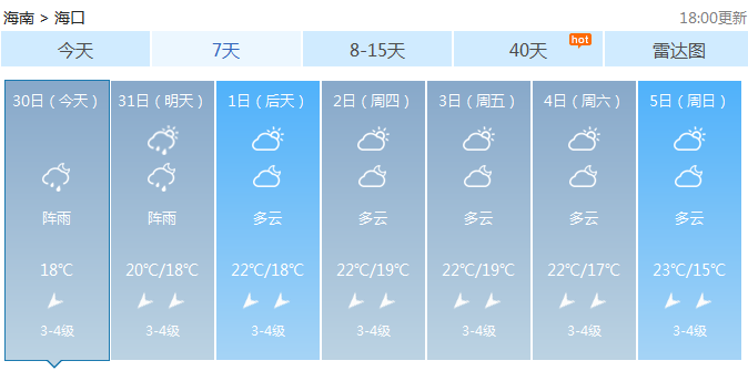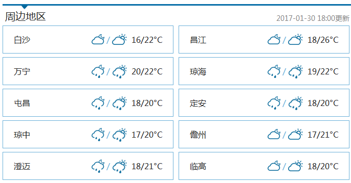 预计31日到2月2日,海南岛北半部多云间阴天,有分散小雨,最低气温西北部内陆地区和中部地区16~18℃,其余地区18~21℃;最高气温五指山以北地区19~22℃,五指山以南地区26~29℃。