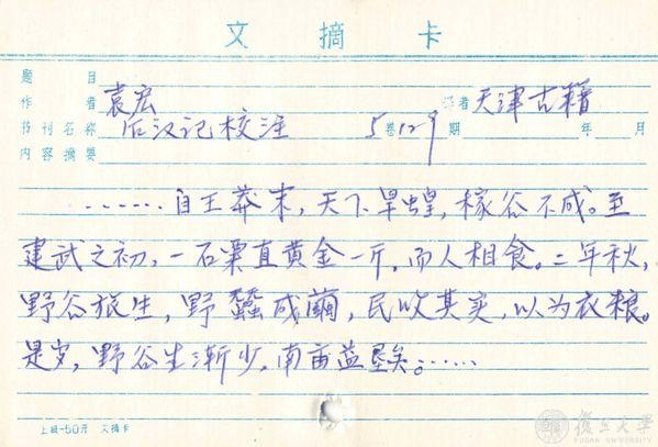 复旦大学史地所老师们手抄的气候史料卡片,此处记录了王莽末年的旱灾和蝗灾,及由此造成的农业欠收和东汉初期百姓饥馑惨状