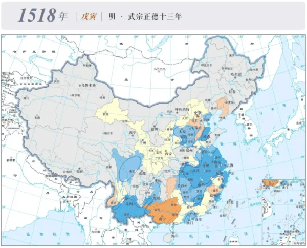 1518年全国出现大面积极端旱涝现象,深橙色为5级旱,深蓝色为1级涝