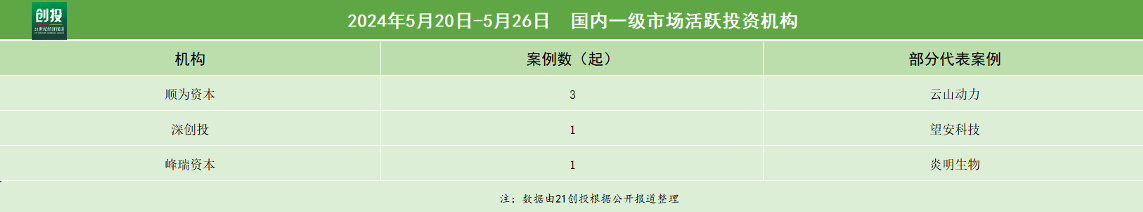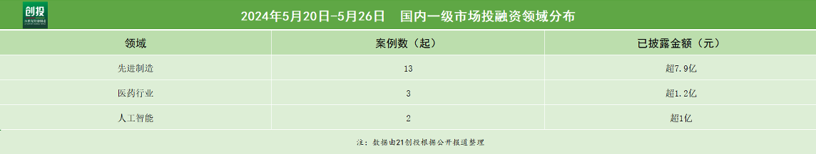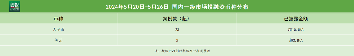 21创投不完全统计,5月20日—5月26日,报告日期内国内一级市场发生融资事件28起。其中,25起融资披露了融资金额和币种信息,总规模超29.4亿元人民币。