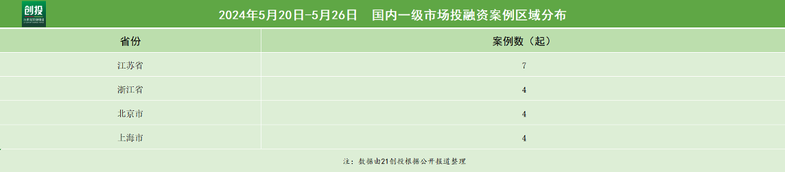 从披露获投企业的地域分布来看,本周的融资地区主要集中在江苏省、浙江省、北京市和上海市,江苏省完成7笔融资,其余地区各完成4笔融资。