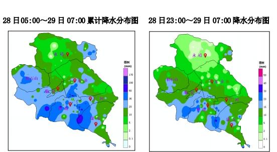 28日23:00~29日07:00县市降水量:临夏市10.3~14.6毫米,永靖0.1~15.0毫米,东乡0.1~16.2毫米,广河1.8~16.7毫米,和政0.3~22.5毫米,康乐8.8~35.4毫米,临夏县7.0~27.5毫米,积石山6.4~16.3毫米。28日23:00~29日07:00全州6个乡镇最大风速7级(13.8m/s 以上):永靖三条岘19.9、陈井18.4、关山14.4,东乡董岭15.4、果园14.7、锁南14.0。