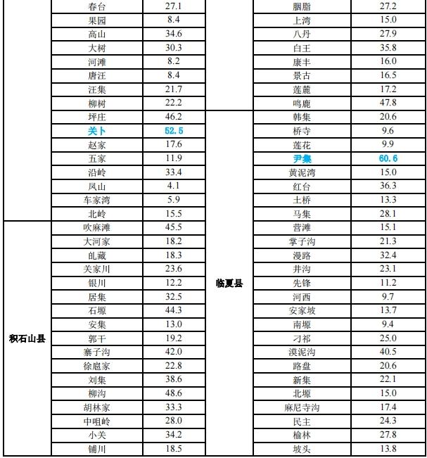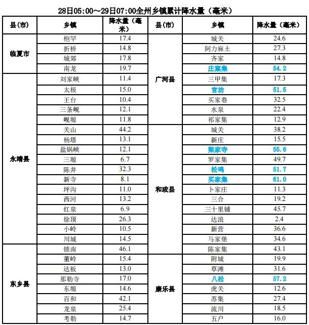 28日05:00~29日07:00全州累计降水量2.4~61.0毫米,最大降水和政买家集61.0毫米,较大降水落区在积石山太子山沿线、永靖东山、东乡西南部。50毫米以上8个乡镇:和政买家集61.0、梁家寺55.6、松鸣 51.7,临夏县尹集60.6,康乐八松57.2,广河庄窠集54.2、官坊51.5,东乡关卜52.5;25~50毫米40个乡镇,10~25毫米63个乡镇,10毫米以下12个乡镇。县市降水量:临夏市14.8~19.7毫米,永靖6.7~44.2 毫米,东乡5.9~52.5毫米,广河12.9~54.2毫米,和政2.4~61.0毫米,康乐12.6~57.2毫米,临夏县9.6~60.6毫米,积石山12.2~48.6毫米。