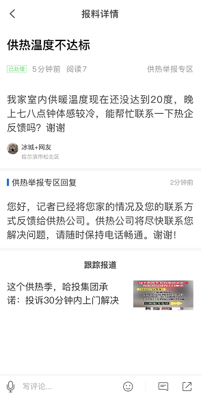 冰城+客户端作为哈尔滨市融媒体中心的官方客户端,是哈尔滨的互联网主阵地和舆论传播主平台,哈尔滨的权威统一“入口”“出口”。冰城+客户端开通供暖投诉平台后,市民关于室温不达标的投诉等供热相关问题,均可通过投诉平台反映,哈尔滨日报将派出记者实地采访,同时将问题反馈给相关热企,力争第一时间解决问题;对于供热疑难问题,将协助督促有关方面查明原因,促进问题妥善解决。