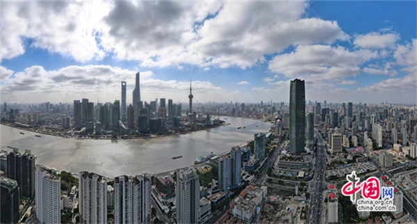 2023年1月10日,从上海虹口区北外滩空中俯瞰中国(上海)自由贸易试验区陆家嘴片区(无人机全景照片)。新华社图片库