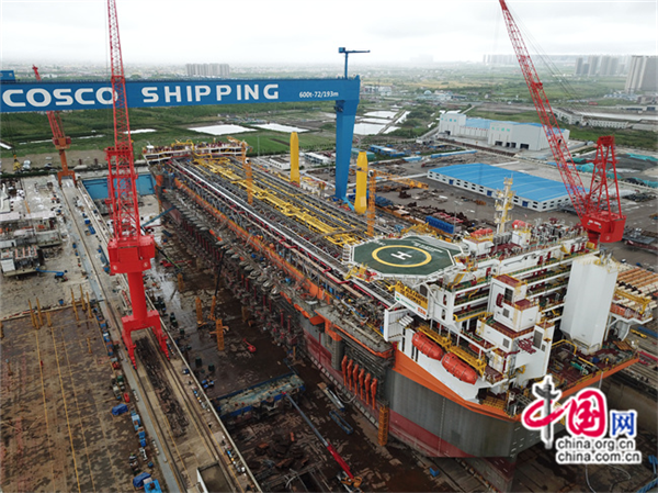 2023年5月19日,江苏省南通市启东海工船舶工业园,正在建造世界最大吨位级新型海上浮式生产储卸油船。(无人机照片)新华社图片库/新华社记者 马宁 摄