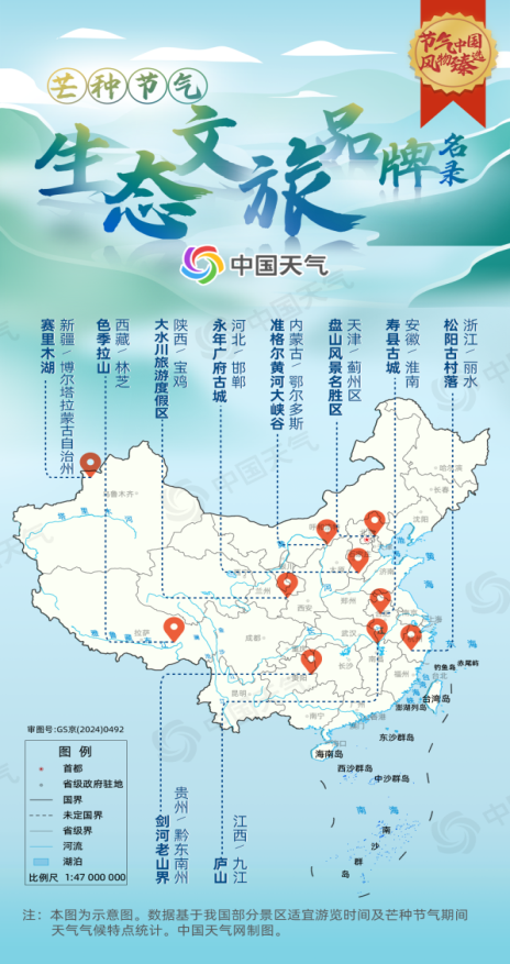 6月5日12时,由中国气象局应急减灾与公共服务司主办、华风气象传媒集团承办的“节气中国 风物臻选”公益助农发布会在京举行,向广大公众发布了首批《节气名优特产品名录》与《节气生态文旅品牌名录》。即从全国各地优选出芒种时节最具代表性的10种农特产品以及10个旅游推介地,以地图产品的形式进行发布。入选的所有名录地区和产品,将在中央广播电视总台《新闻联播》后的《天气预报》栏目或CCTV17-农业频道进行公益展播,并通过16家媒体矩阵进行同步直播或图文宣发。不同的应时美景,时令生鲜,邀请人们纵情山水之间,共赴味蕾盛宴。不知道,您家乡的美食美景是否在名录里呢?