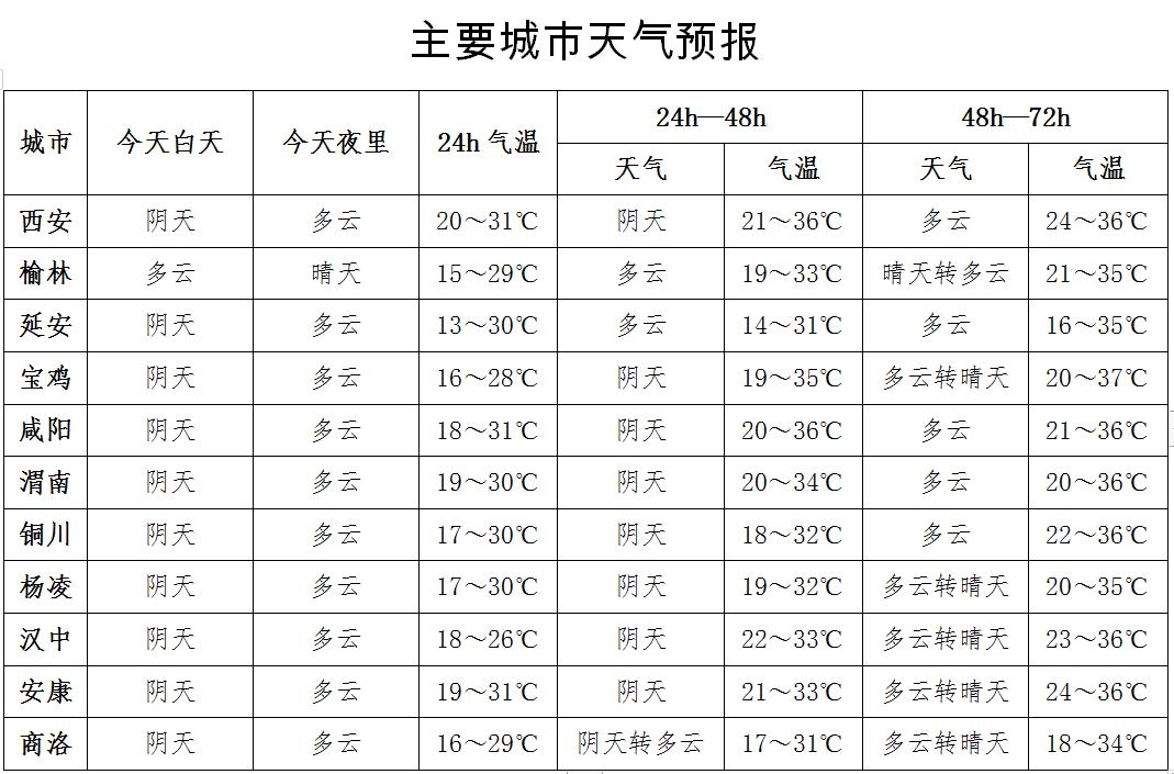 12日:全省阴天转晴天,陕北南部局地、关中南部局地有阵雨。陕北部分、关中大部、陕南部分地方有35~37℃的高温天气,局地可达38℃。