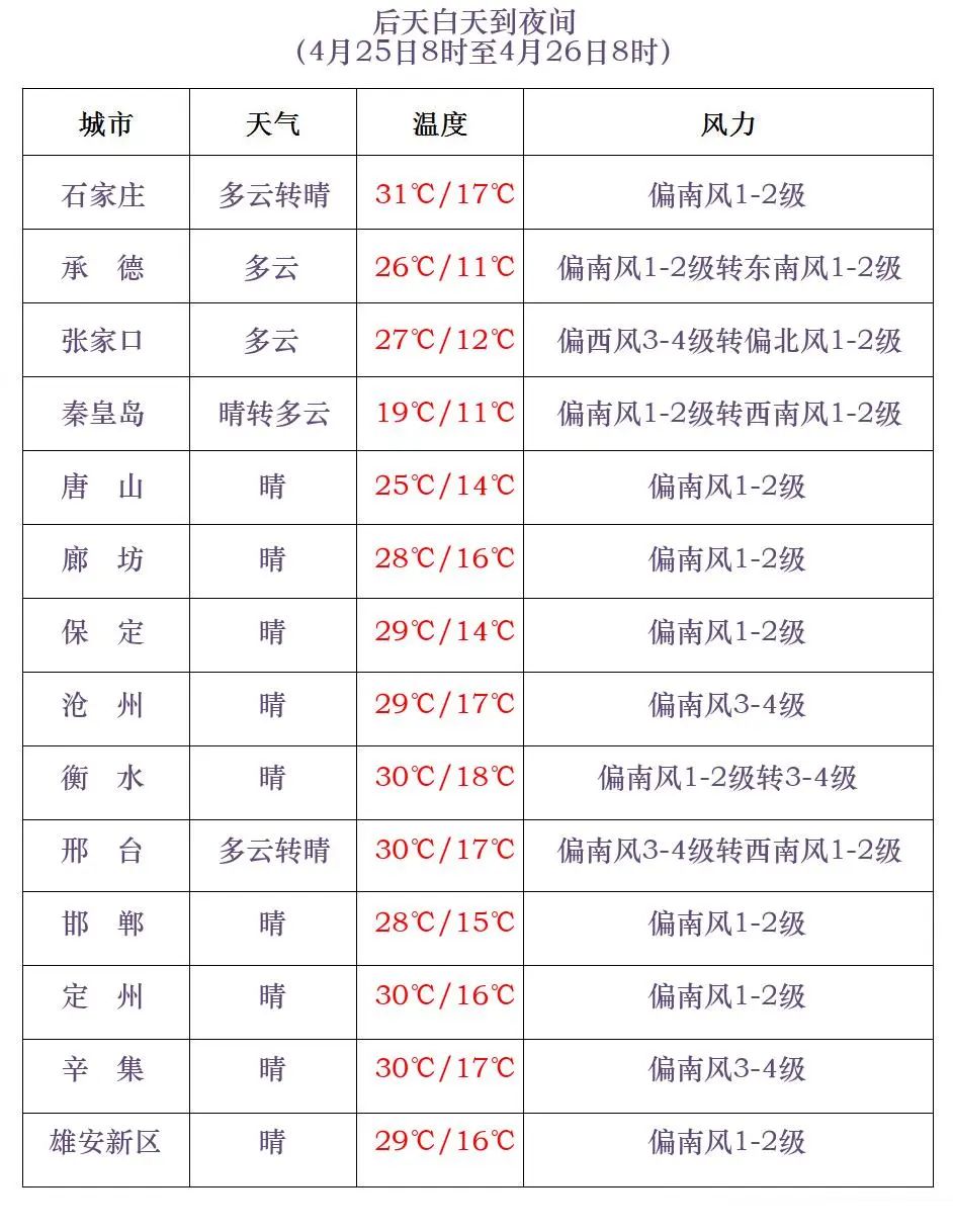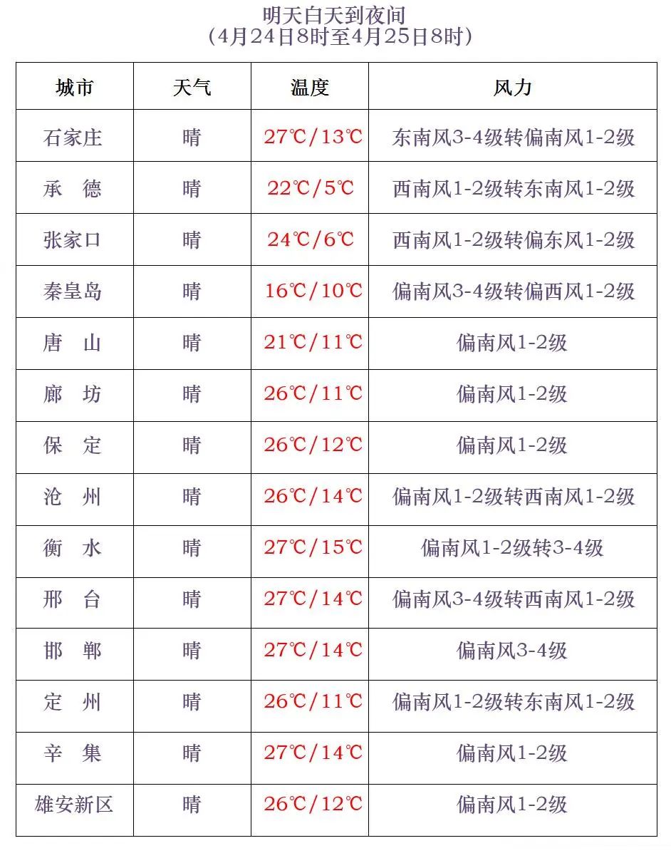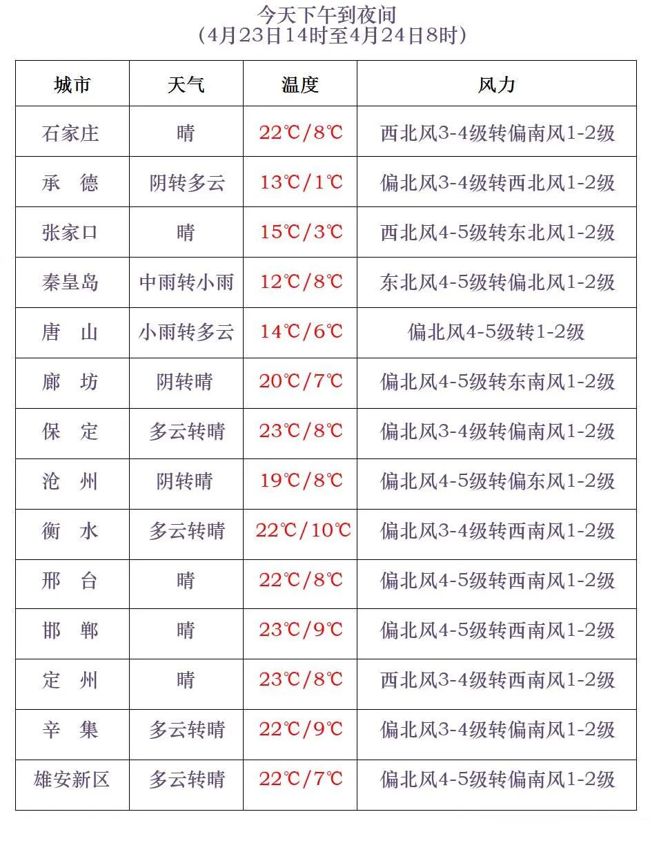 河北省气象台2024年4月23日11时发布天气预报: