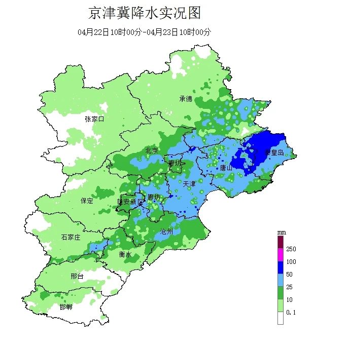 今天上午10时降水区位于承德东部、唐山、秦皇岛地区,将于午后逐渐东移出河北省。
