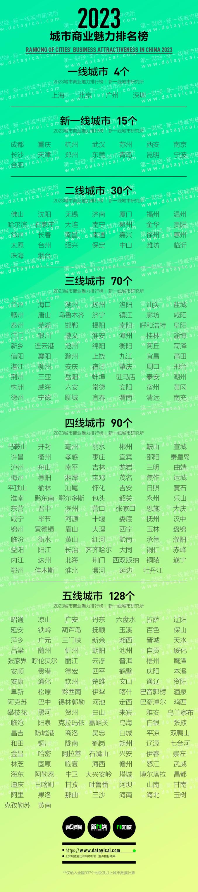 5月30日,第一财经旗下城市数据研究项目新一线城市研究所在上海发布《2023城市商业魅力排行榜》。通过近200个品牌、17家互联网公司和数据机构的城市大数据,围绕商业资源集聚度、城市枢纽性、城市人活跃度、生活方式多样性和未来可塑性五大一级维度来评估337座地级及以上城市。