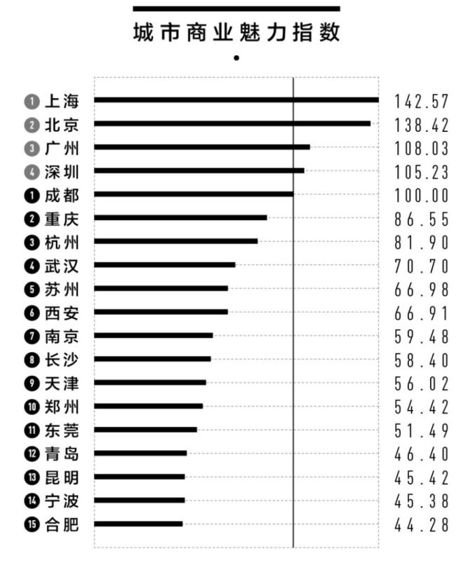 《城市商业魅力排行榜》的指标体系包含了商业资源集聚度、城市枢纽性、城市人活跃度、生活方式多样性和未来可塑性五大一级维度。榜单的一级与二级维度权重以新一线城市研究所专家委员会打分的方式计入,二级维度以下指标数据则采用主成分分析法。