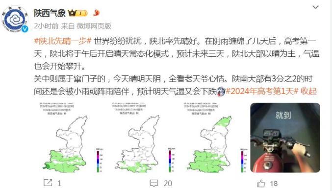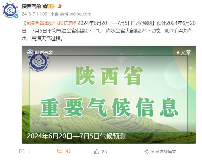 预计2024年6月20日—7月5日平均气温全省偏高0~1℃;降水全省大部偏少1~2成,陕北北部、关中东部、陕南南部接近常年略偏少0~1成。