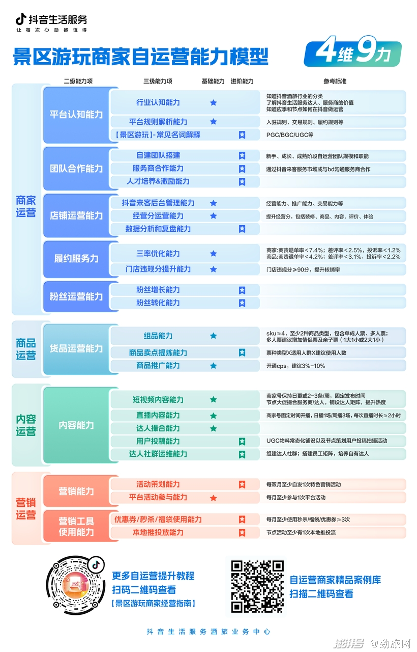 “景区运营4维9力模型只是抖音景区扶持策略中的一项。”抖音生活服务酒旅行业景区游玩业务负责人武永杰解释,这一扶持策略完整内容还包括1个扶持模式(定位问题+定向培训+定向帮扶)+2个标准工具(经营分诊断工具和4维9力模型)+1个学习入口(《景区游玩商家经营指南》)+流量扶持(完成官方指定任务获得流量奖励)。