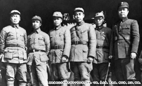 周恩来同志和新四军领导干部合影。右起:叶挺、朱克靖、周恩来、傅秋涛、粟裕、陈毅。