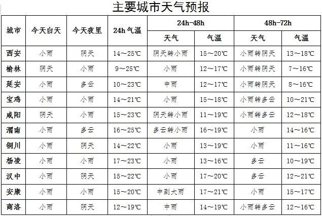 2日: 全省阴天有小到中雨(1~15毫米),陕北东部部分、关中西部局地、陕南部分地方有大雨(25~40毫米)。陕北北部有4级左右偏南风转偏北风。日平均气温全省下降4℃左右,其中榆林北部、关中中东部下降6℃~8℃,局地可达8℃以上。