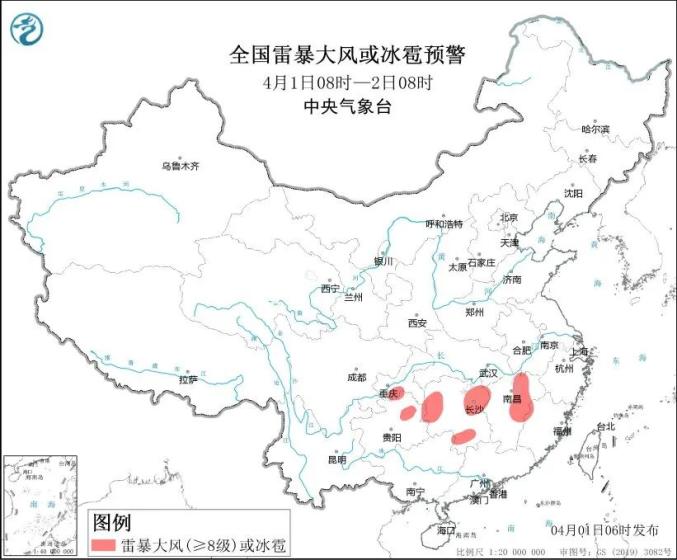 预计4月1日08时至2日08时,湖南北部和东南部、江西中北部、重庆南部、贵州东北部等地的部分地区将有8-10级雷暴大风或冰雹天气;河南南部、安徽南部、江苏南部、湖北中东部和南部、湖南中北部、江西中东部和西北部、浙江西部、福建东南部和西部、重庆南部和东北部、贵州东北部、云南西北部、广西东北部等地的部分地区将有短时强降水天气,最大小时雨量30-50毫米,局地可达70毫米以上。