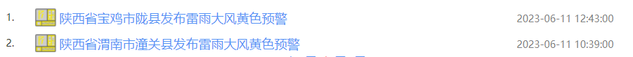 宝鸡陇县气象台2023年06月11日12时43分发布雷雨大风黄色预警信号:未来6小时内我县新集川镇、固关镇、曹家湾镇、天成镇、东南镇部分地区可能受雷雨大风影响 ,阵风可达7级或以上并伴 有雷电,局地可能出现短时暴雨、冰雹等强对流天气 ,小时雨量可达10毫米以上,请注意防范。