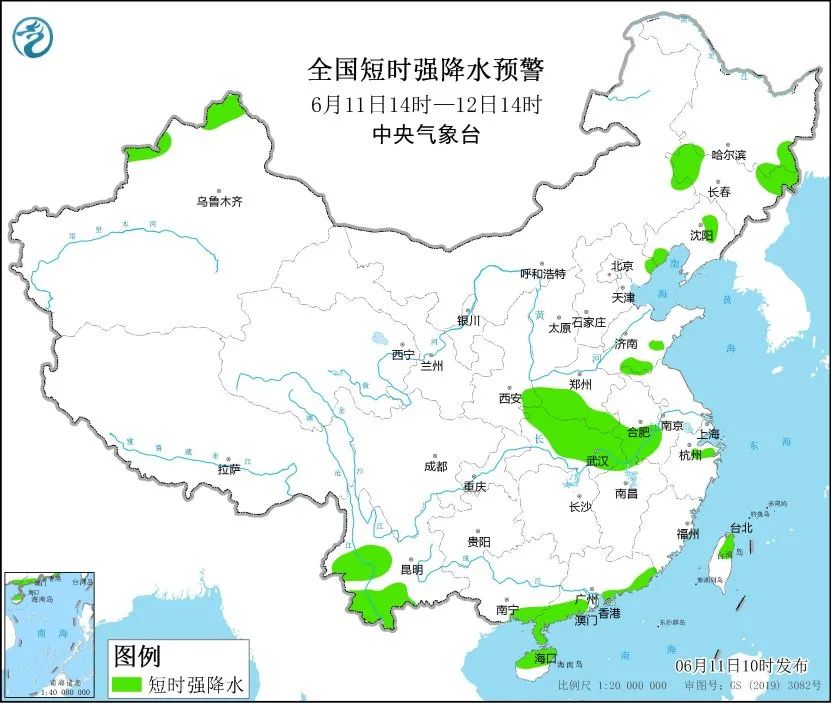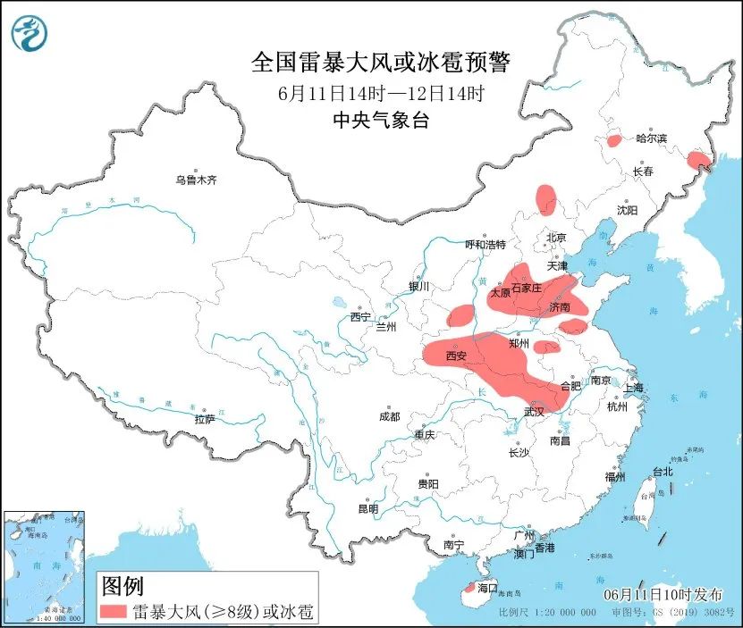 预计6月11日14时至12日14时 ,吉林东北部和西部、陕西中部 、山西中东部、河北北部和南部、山东中北部和南部、河南南部和西部、安徽西南部、湖北北部和东部、海南岛西北部等地的部分地区将有 8-10级雷暴大风或冰雹天气 ,局地风力可达11级以上 ;吉林东北部和西部、辽宁中部和南部、新疆北疆北部和伊犁河谷、陕西东南部 、山东南部、河南南部、安徽中南部、湖北北部和东部、浙江北部、云南西南部和中部、广西东南部沿海、广东南部、海南岛中北部、台湾岛北部等地的部分地区将有短时强降水天气 ,小时雨量20-40毫米,局地可达60毫米以上。