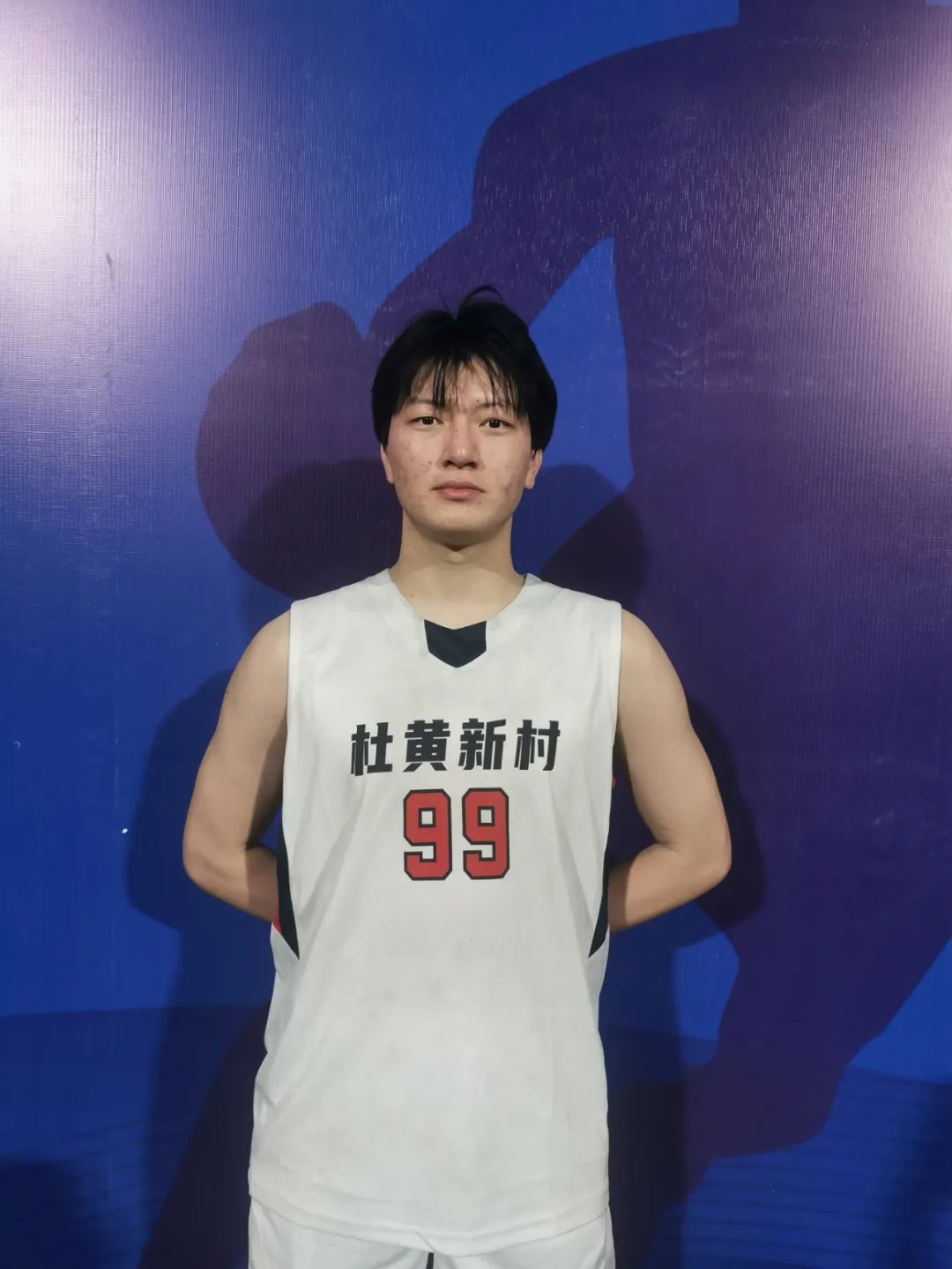 王中泽,20岁,在校学生,杜黄新村99号球员,擅长大前锋,场均得分11.2。