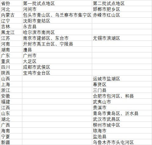 这17个县市区包括:河北省邯郸市肥乡区,山西省运城市盐湖区,内蒙古自治区赤峰市红山区,上海市奉贤区,江苏省无锡市滨湖区,浙江省三门县,安徽省合肥市包河区、和县,福建省武夷山市,江西省贵溪市,山东省青岛市黄岛区、沂水县,湖北省武汉市武昌区,广西壮族自治区柳州市城中区,海南省琼海市,宁夏回族自治区盐池县,新疆维吾尔自治区乌鲁木齐市头屯河区。