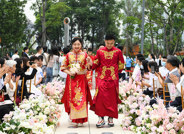 5月20日,在成都高新区桂溪生态公园婚姻登记处,新人们携手走进集体婚礼颁证仪式现场。新华社