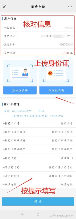 在提交用户信息后,如提供的身份证信息与户主信息不符、身份证照片模糊不清无法识别、银行卡开户姓名与户主信息不符,会通过微信公众号发送提醒信息,请根据提示核对信息后在公众号中“我的记录”“结算退费记录”中,找到提交的申请,然后点击查看详情并进行修改,最后请进行二次提交。