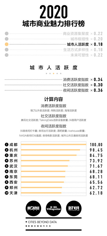 消费活跃度指标收集了饿了么外卖数据、淘宝天猫网购与海淘数据,它衡量了城市的餐饮与购物的总体支付能力和市场规模,还反映了城市商业的丰富度与饱和度,从中可观察城市人消费行为的模式与倾向。