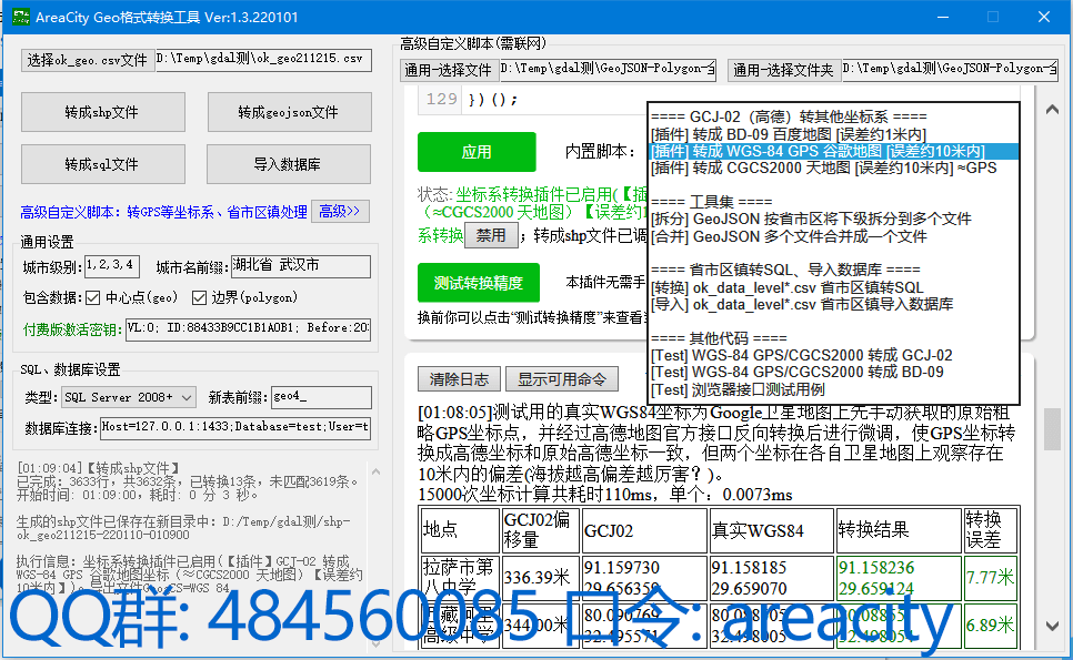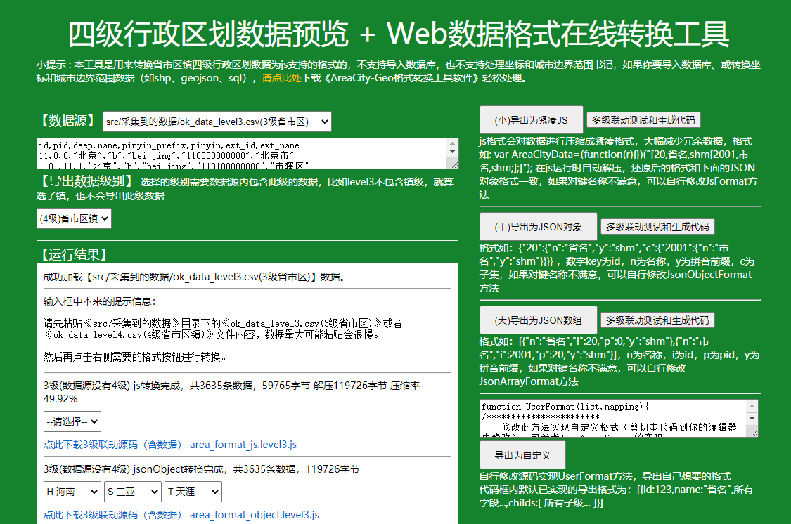 AreaCity-Geo格式转换工具软件(gitee镜像)用于将采集到的 ok_geo.csv 省市区乡镇坐标和边界范围文件转成其他格式,也支持将 ok_data_level*.csv 省市区镇行政区划数据导入数据库。